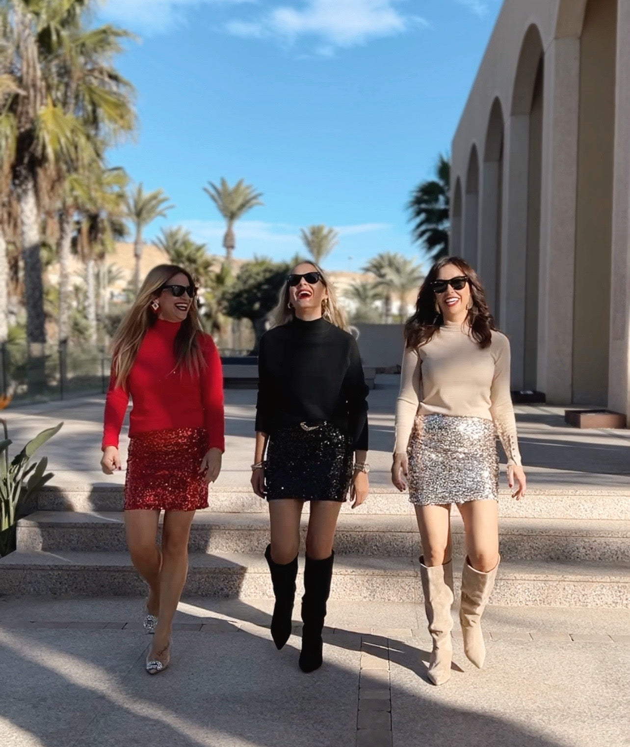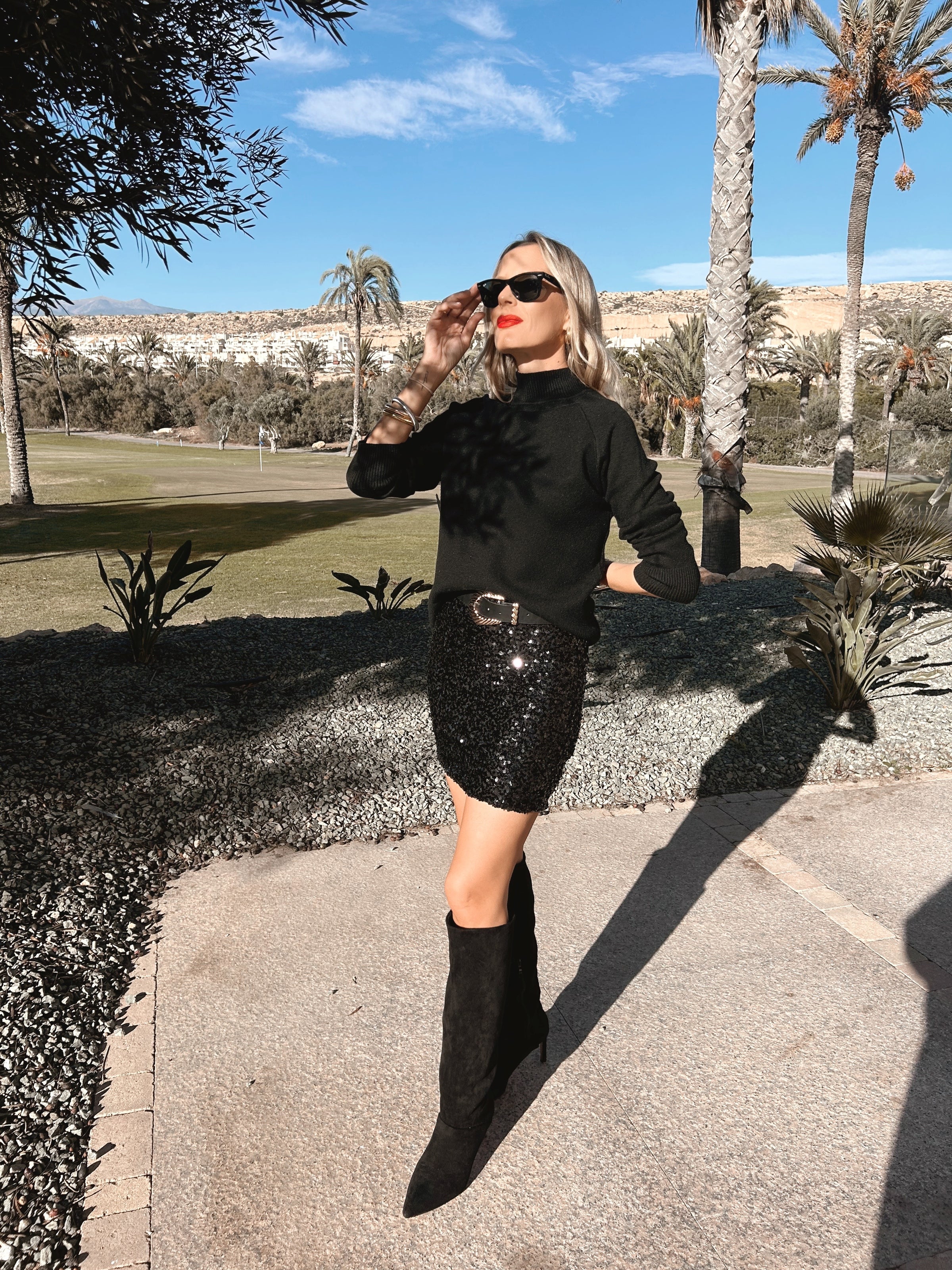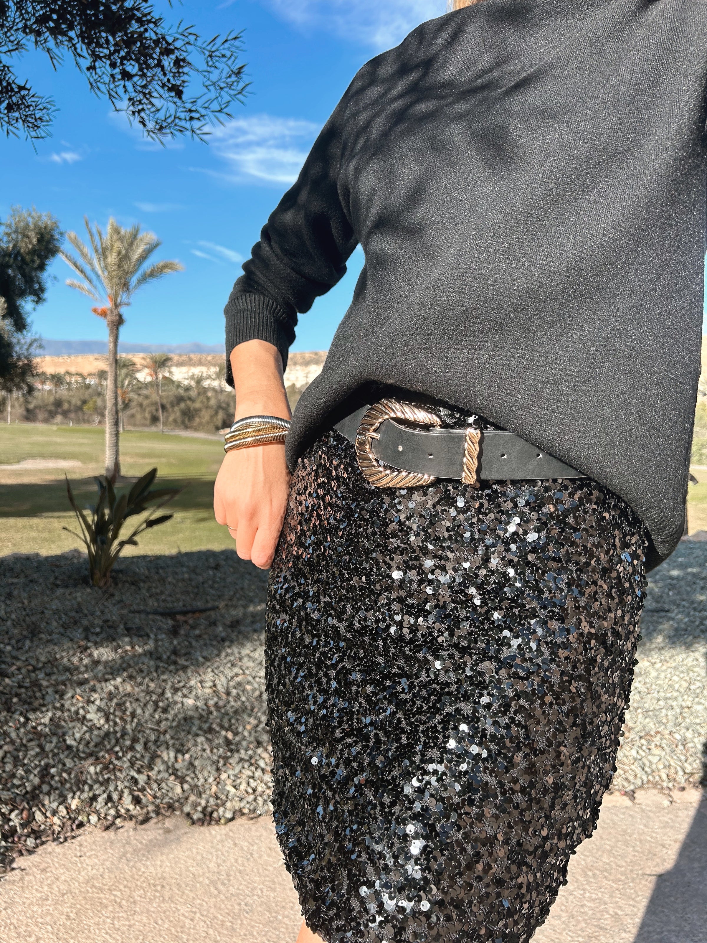 Falda de lentejuelas en color negro, forro interior y goma en cintura.